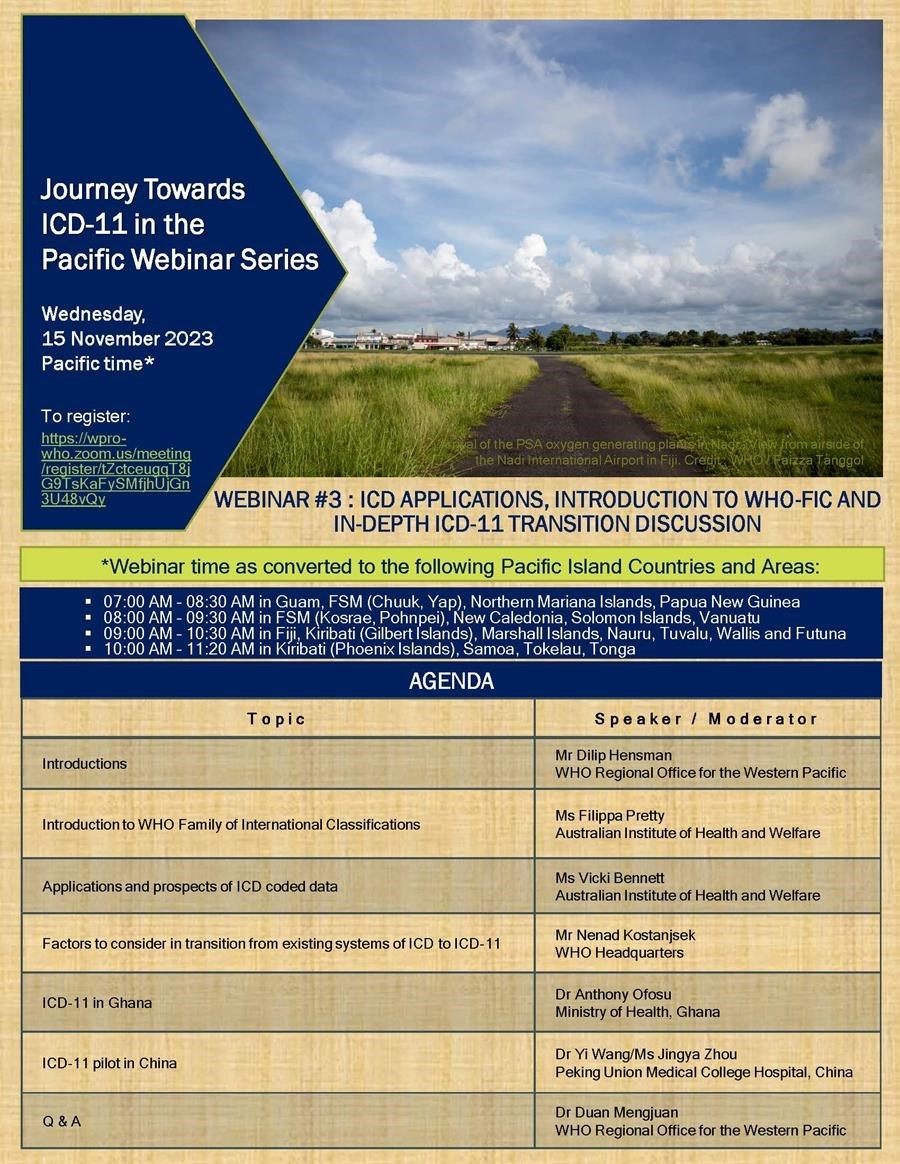 The PACIFIC CIVIL REGISTRARS NETWORK (PCRN) will be organizing the third webinar in the Webinar series (Journey Towards ICD-11 in the Pacific) on ICD applications, introduction to WHO-FIC and in-depth ICD-11 transition discussion.