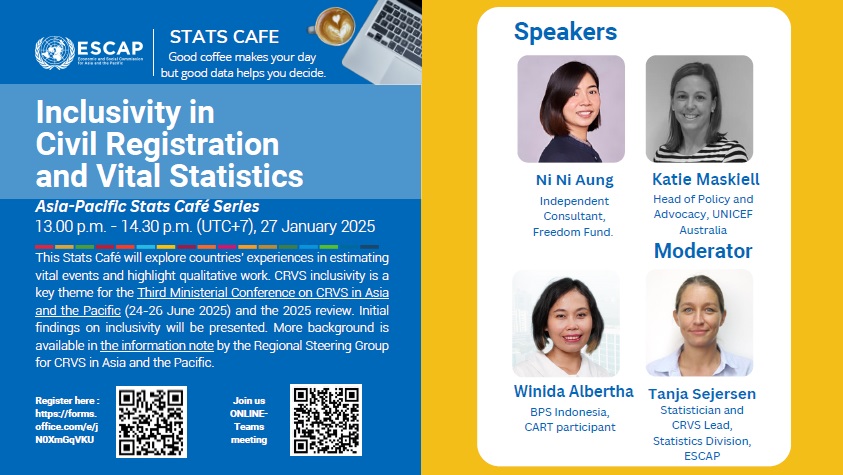 Over the past decade, the Asia-Pacific region has significantly advanced its civil registration and vital statistics (CRVS) systems, notably reducing unregistered births. Despite this progress, challenges persist, such as enhancing the completeness of CRVS data and addressing disparities in access to these services. This Stats Café will explore countries' experiences in estimating the completeness of vital events and explore qualitative research on CRVS inclusivity, with inclusivity a central theme for the upcoming Ministerial Conference on CRVS.