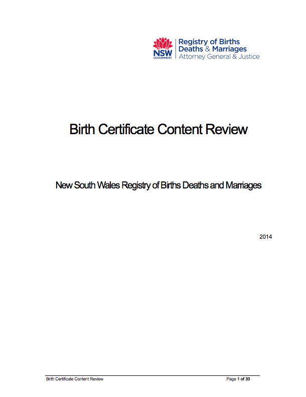 The New South Wales Registry of Births Deaths and Marriages (“the Registry”) is reviewing the content of birth certificates in Australia. This review is being undertaken for the following reasons: To examine changes in how birth certificates are used; in consideration of how birth certificates can best reflect the changing composition of families in Australia; and in response to recommendations of the Senate Community Affairs Committee inquiry into the Commonwealth’s role in former adoption policies and practices.