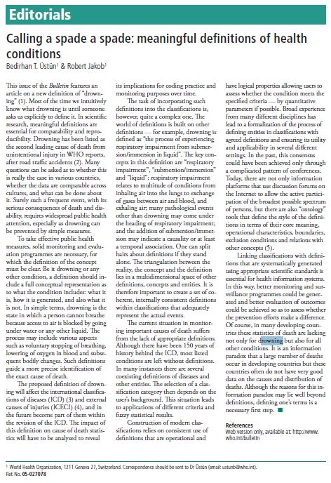 The article introduced a new definition of “drowning” (1). Most of the time we intuitively know what drowning is until someone asks us explicitly to define it. In scientific research, meaningful definitions are essential for comparability and reproducibility. Drowning has been listed as the second leading cause of death from unintentional injury in WHO reports, after road traffic accidents (2). Many questions can be asked as to whether this is really the case in various countries, whether the data are comparable across cultures, and what can be done about it. Surely such a frequent event, with its serious consequences of death and disability, requires widespread public health attention, especially as drowning can be prevented by simple measures.