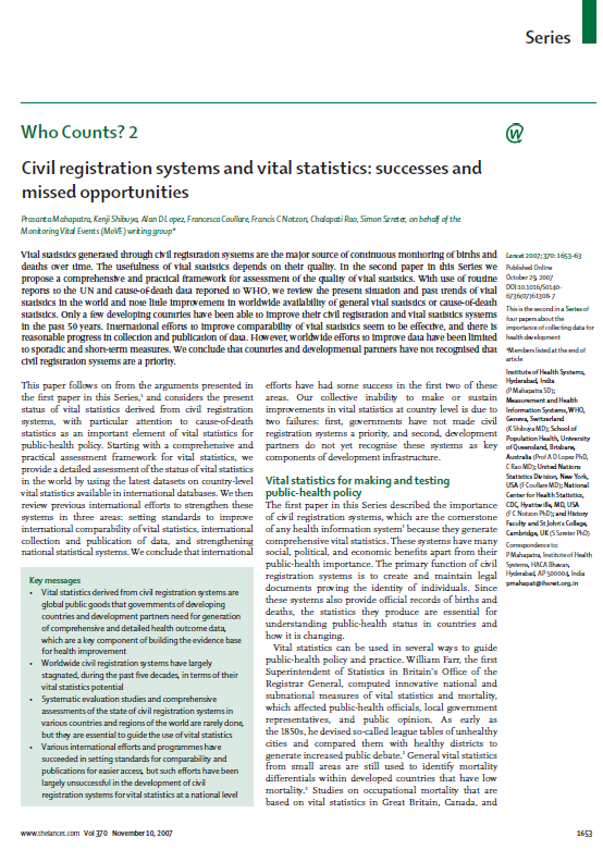 This paper was published in 2007 as a part of the “The Who Counts?” Series of The Lancet. The authors Mahapatra et. al review the present situation and past trends of vital statistics in the world.