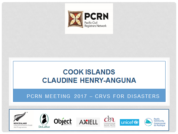 The Cook Islands' presentation at the 2017 PCRN Meeting on CRVS for Disasters held from 2-4 October in Suva, Fiji. The workshop was supported by the New Zealand Ministry of Foreign Affairs and members of the Brisbane Accord Group (BAG).