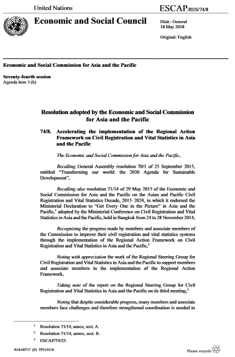 ESCAP Resolution 74/8 - Accelerating the implementation of the Regional Action Framework on Civil Registration and Vital Statistics in Asia and the Pacific