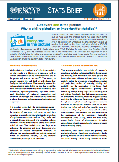 Statistics such as “135 million children under the age of five in Asia and the Pacific have not had their births registered”2 or “9 out of 10 people in Asia and the Pacific live in countries with unreliable death statistics”3 make us realize that civil registration and vital statistics (CRVS) systems in Asia and the Pacific need to be improved. The Ministerial Conference on Civil Registration and Vital Statistics in Asia and the Pacific, 24-28 November 2014, aims to increase awareness of the importance of universal civil registration and reliable vital statistics for rights, governance and better statistics, and to generate firm commitment and accountability for results from governments and development partners, through a Ministerial Declaration and a Regional Action Framework.