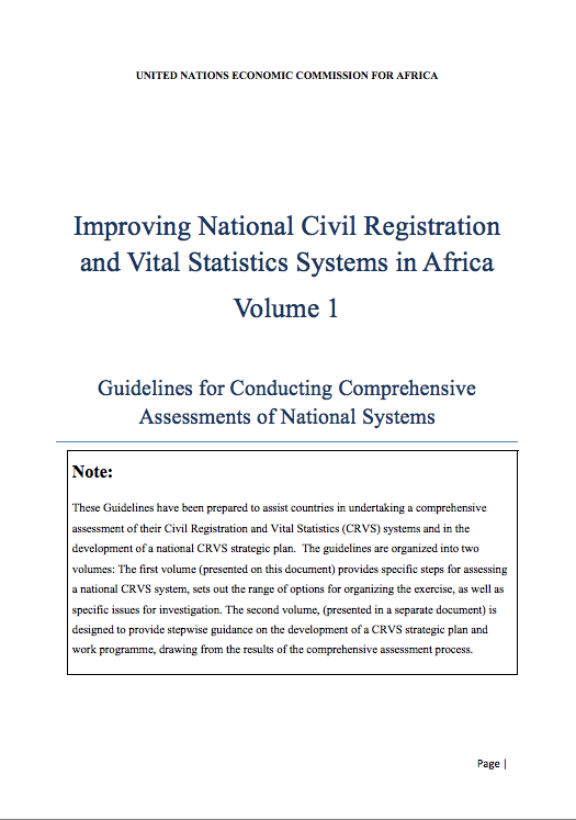These Guidelines have been prepared to assist African countries in undertaking a comprehensive assessment of their Civil Registration and Vital Statistics (CRVS) systems and in the development of a national CRVS strategic plan. The guidelines are organized into two volumes: The first volume (presented on this document) provides specific steps for assessing a national CRVS system in Africa, sets out the range of options for organizing the exercise, as well as specific issues for investigation.