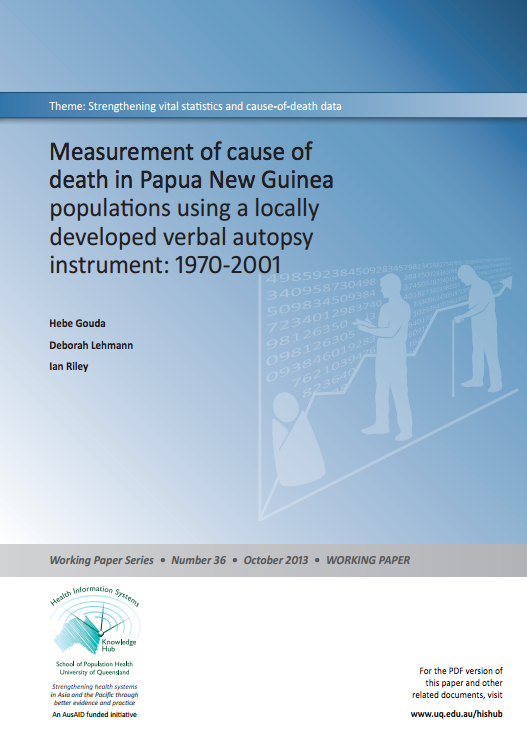 The VAI was initially designed to be used by field reporters with minimal schooling and had only 18 symptom questions. It also allowed for the recording of a brief open-ended narrative, the place of death, any treatment by health services, and the type of treatment. The disease classification was based on Lay reporting of health information (WHO 1978) and COD was entered into the international form of the death certificate. Verbal autopsies (VAs) were physician-coded with reference to diagnostic algorithms. In this working paper, details of 8489 deaths (6809 from Tari, 812 from Asaro, 461 from Wosera and 407 from Madang) are reported. Leading CODs were pneumonia (21.8%), chronic (non-tuberculous) lung disease (13.5%), diarrhoea/dysentery (8.3%), injury (7.3%), “other fevers” (7.3% %), and “other respiratory” (4.2%). This short VA instrument was designed for a specific purpose in a particular environment. Considering its limitations, it gives a broad but remarkably accurate description of PNG rural mortality over a period of more than 30 years.