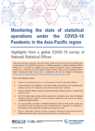 This report presents a summary of the Asia-Pacific results of the second round of a global survey on the impacts of the COVID-19 pandemic on statistical operations of National Statistical Offices launched on 7 July 2020. The global survey was carried out under the aegis of United Nations Department of Economic and Social Affairs Statistics Division (UNSD), in partnership with World Bank’s Development Data Group and in coordination with the UN Regional Commissions.