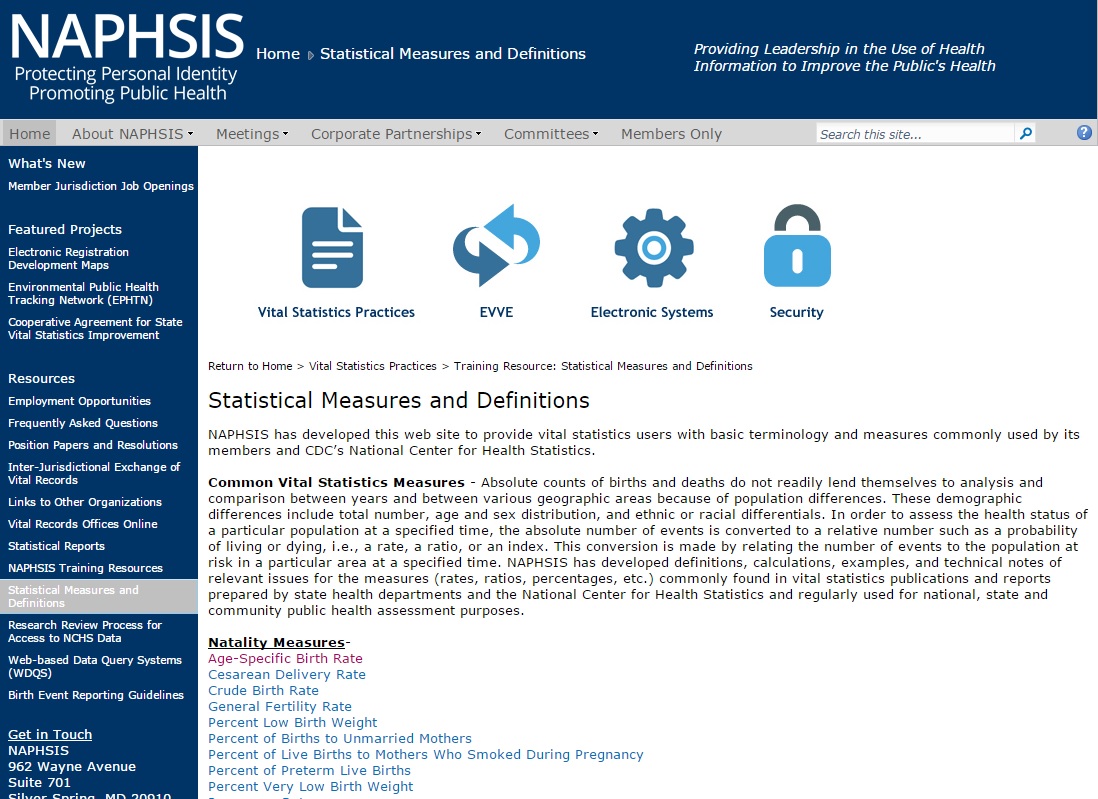 National Association for Public Health Statistics and Information Systems, Statistical Measures and Definitions