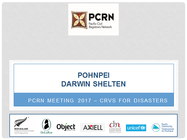 Pohnpei's presentation at the 2017 PCRN Meeting on CRVS for Disasters held from 2-4 October in Suva, Fiji. The workshop was supported by the New Zealand Ministry of Foreign Affairs and members of the Brisbane Accord Group (BAG). Topics covered in the presentation include: