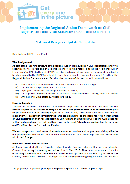 As part of the reporting structure of the Regional Action Framework on Civil Registration and Vital Statistics (CRVS) in Asia and the Pacific, by the end of 2015, members and associate members are required to submit a baseline report to the ESCAP Secretariat through their designated national focal point. This report is the report submitted by Thailand.