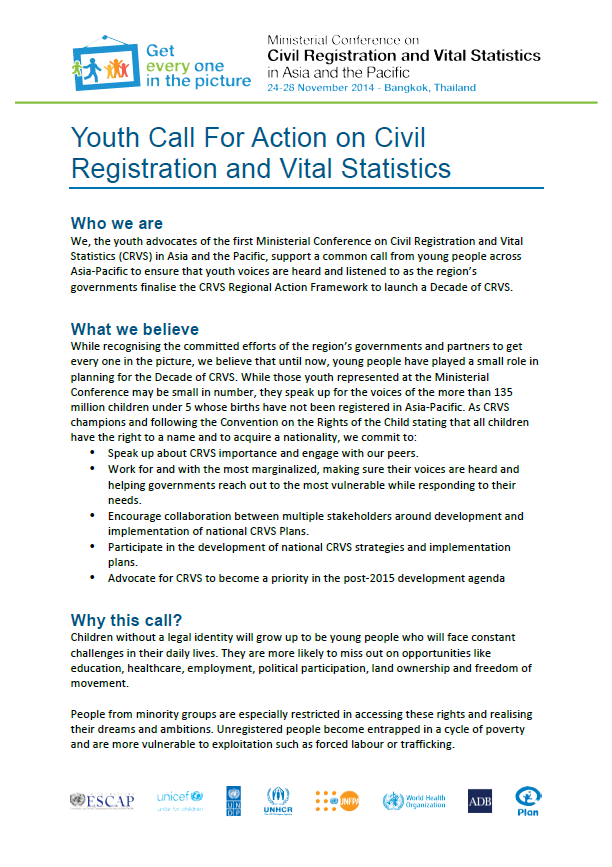 Youth advocates of the Ministerial Conference support a common call from young people across Asia-‐Pacific to ensure that youth voices are heard and listened to as the region finalized the CRVS Regional Action Framework to launch a Decade of CRVS.